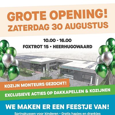 Dakkapellen.nu en Kunststofkozijn.nu hebben op zaterdag 30 augustus 2025 een feestelijke opening van hun nieuwe, bijna verdubbelde pand op bedrijventerrein De Vaandel in Heerhugowaard gehouden. Klanten konden genieten van hapjes en drankjes, kortingen, een prijzenrad en goodiebags. Voor kinderen was er een springkussen en schminken, en er waren rondleidingen door het nieuwe pand.