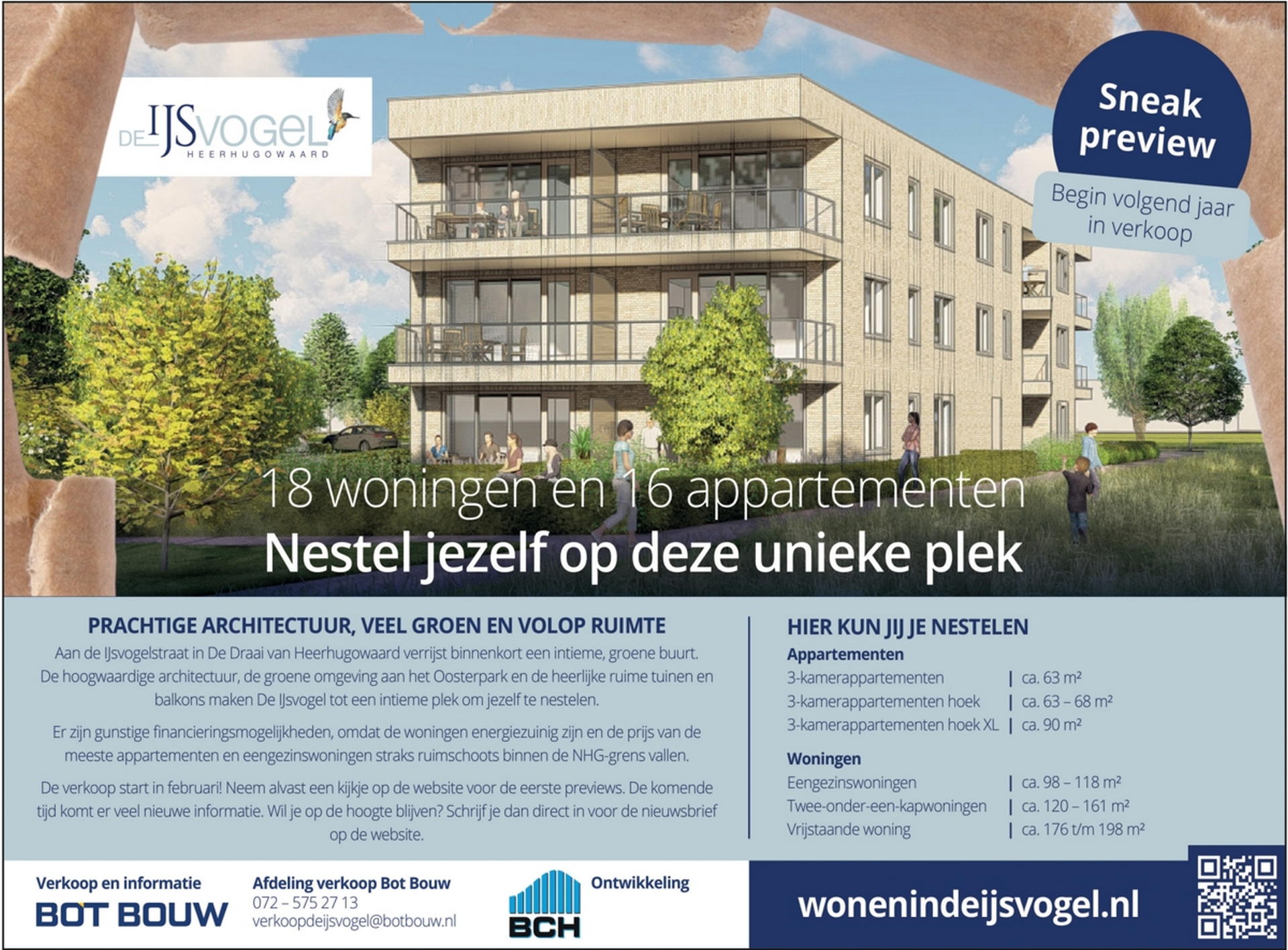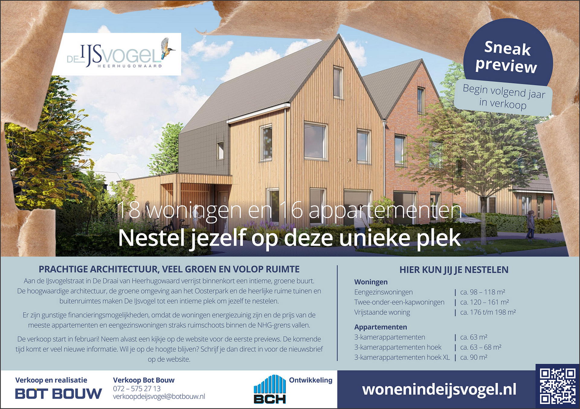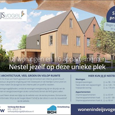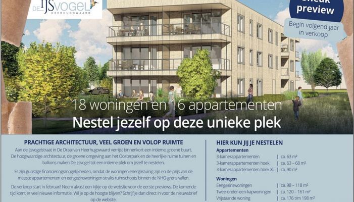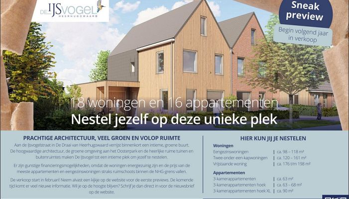 Aan de IJsvogelstraat in De Draai van Heerhugowaard verrijst binnenkort een intieme, groene buurt met 18 woningen en 16 appartementen. De hoogwaardige architectuur, de groene omgeving aan het Oosterpark en de heerlijke ruime tuinen en buitenruimtes maken De IJsvogel tot een intieme plek om jezelf te nestelen.