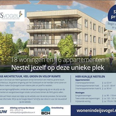 De IJsvogel ligt in de wijk De Draai en direct naast het Oosterpark en nabij water. Het is een van de laatste stukjes in de wijk de Draai waar nog nieuwbouwwoningen worden gerealiseerd. De IJsvogel nestelt zich op een unieke plek in Heerhugowaard, dicht bij uitvalswegen, ‘t Waarderhout en op maar een paar minuten fietsen naar winkelcentrum Middenwaard. De landelijke sfeer van de omgeving zie je terug in de nieuwbouwwijk. De opzet is ruimtelijk en groen speelt de hoofdrol. Niet alleen hebben de 18 woningen grote tuinen, ook het parkeerhof krijgt een groene uitstraling en alle voortuinen worden voorzien van hagen. Het kleinschalige appartementengebouw ligt direct aan het Oosterpark en beschikt, naast ruime balkons en privé-tuinen, over een prachtige gezamenlijke tuin waar je heerlijk kunt ontspannen tussen het groen.
