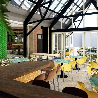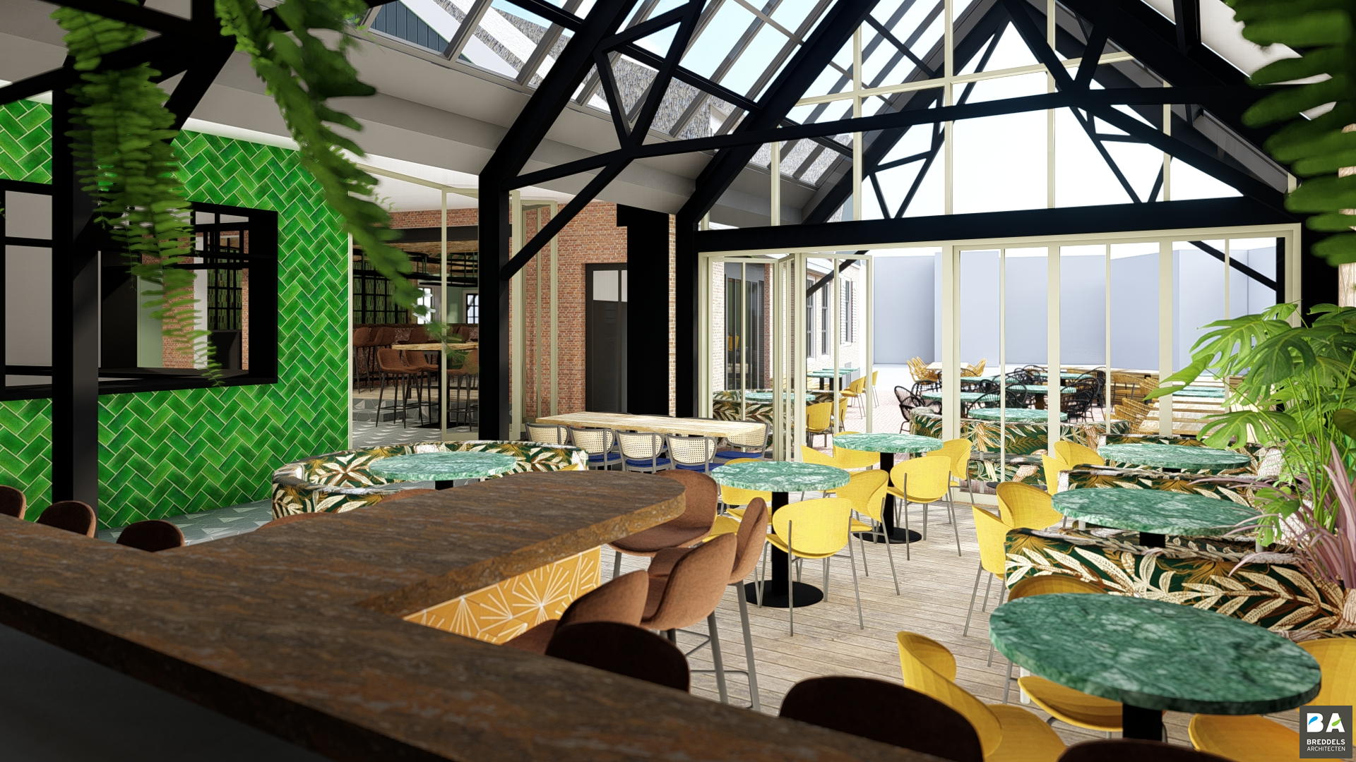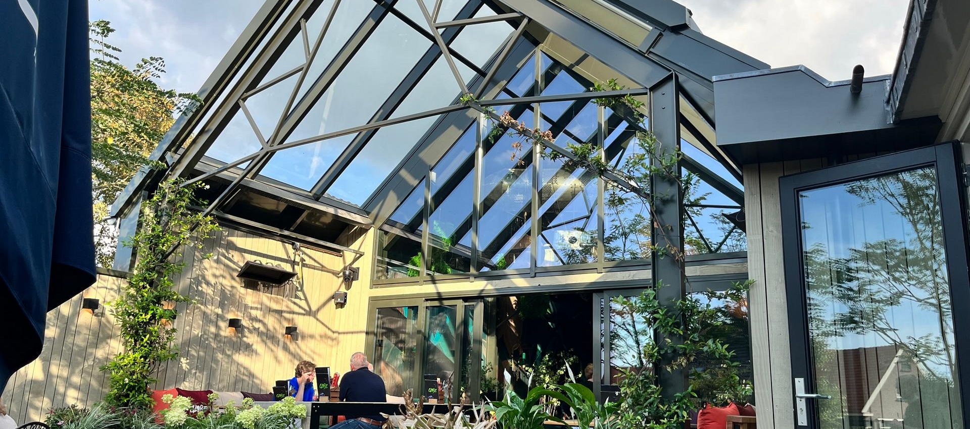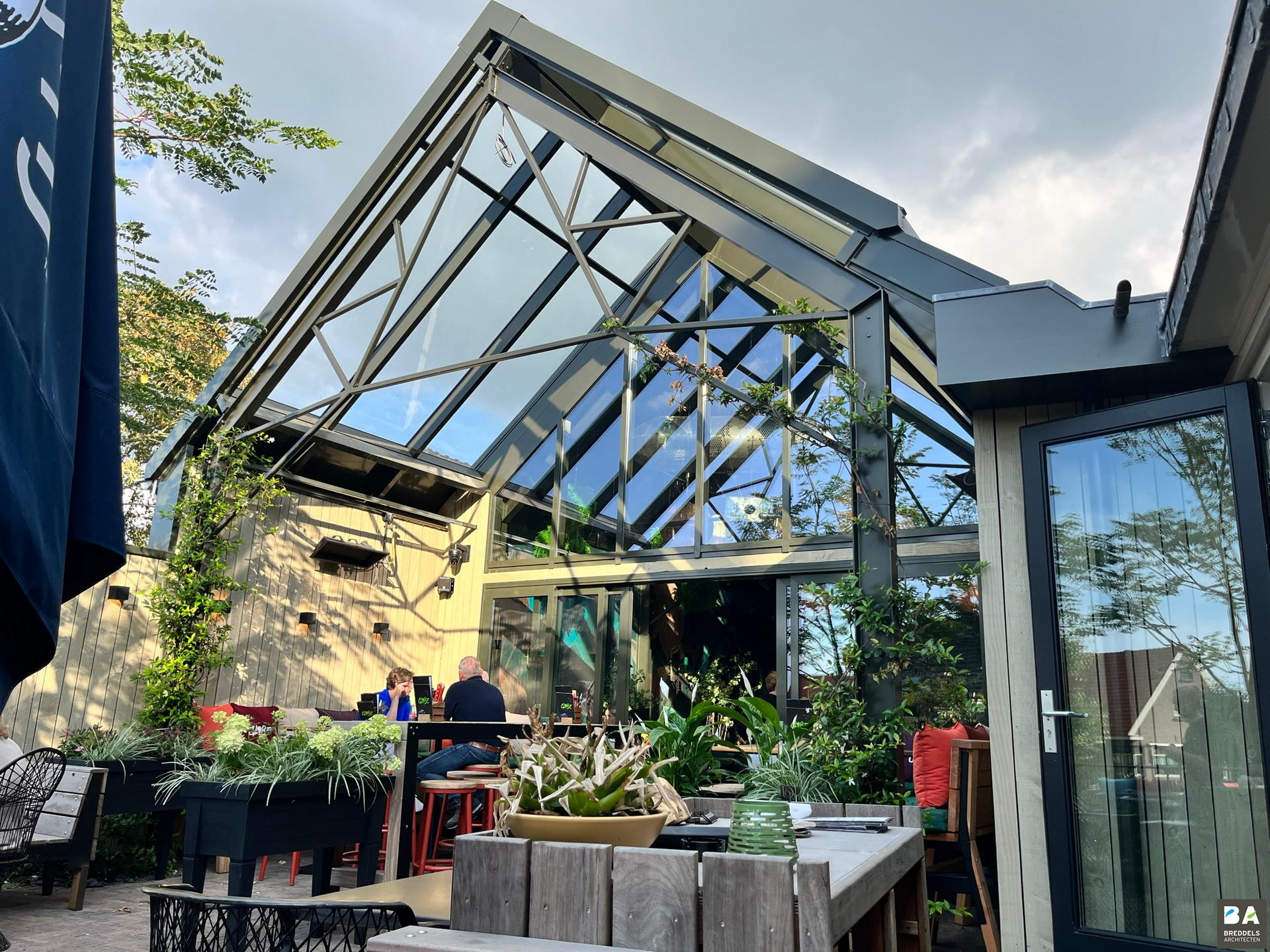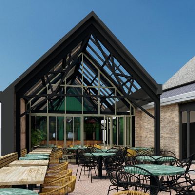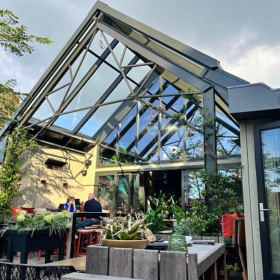 Voor het ontwerp van de uitbreiding hebben we het contrast met het monument gezocht door middel van een oranjerie-achtige glazen dak en voorgevel. Het interieur van beide ruimtes is in goed overleg ingericht door Deb.Styles, specialist op het gebied van horecazaken.