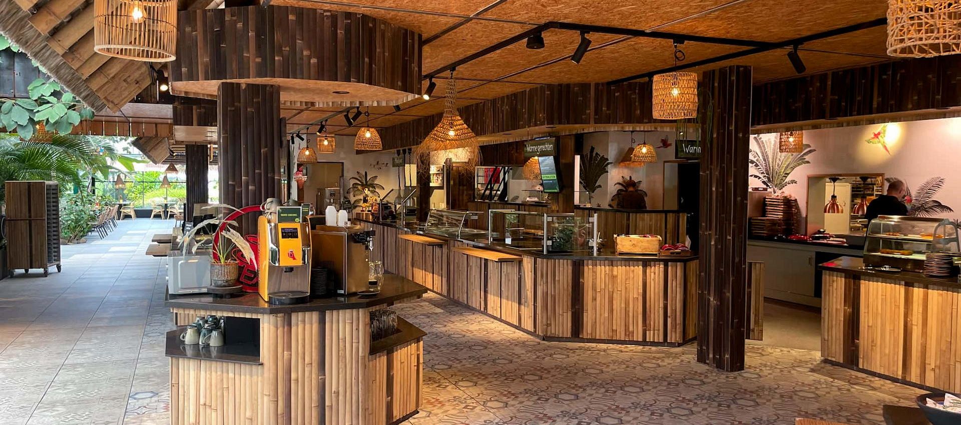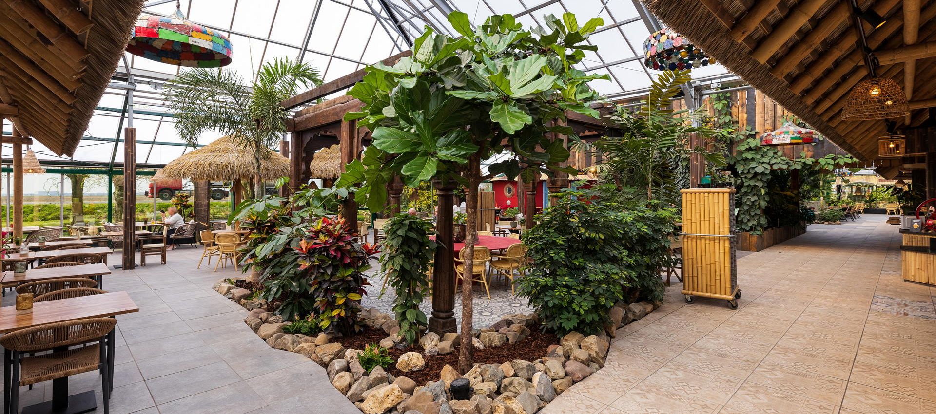 Het oude balkenplafond van het restaurant is verwijderd en je kijkt nu tot in de nok van de deels verhoogde kasconstructies. De hoogte en het licht geven ruimte aan mooie plantvakken met volwaardig groen. Tussen de beplanting zijn vele sfeervolle zitjes gecreëerd en door het realiseren van verschillende hutjes en straatjes komt de junglesfeer optimaal tot zijn recht. Boven het compleet vernieuwde buffet is een verdiepingsvloer geplaatst zodat er binnen dezelfde ruimte ook plaats is voor een intiem gezelschap. Door het gebruik van oude en gerecyclede materialen en de grote creativiteit van de gebroeders Maarssen is het restaurant onderdeel van de beleving geworden.