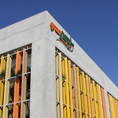 Nader onderzoek leerde ons echter dat deze gevel binnen twee jaar al armoedig zou ogen door de enorme zonbelasting, zodat we stalen wingprofielen hebben ontworpen in 7 tonsurton kleuren met af en toe een bedrijfsoranje ertussen. Deze breezes bevinden zich op onregelmatige afstanden van elkaar zodat er een levendig en dynamisch beeld ontstaat.
