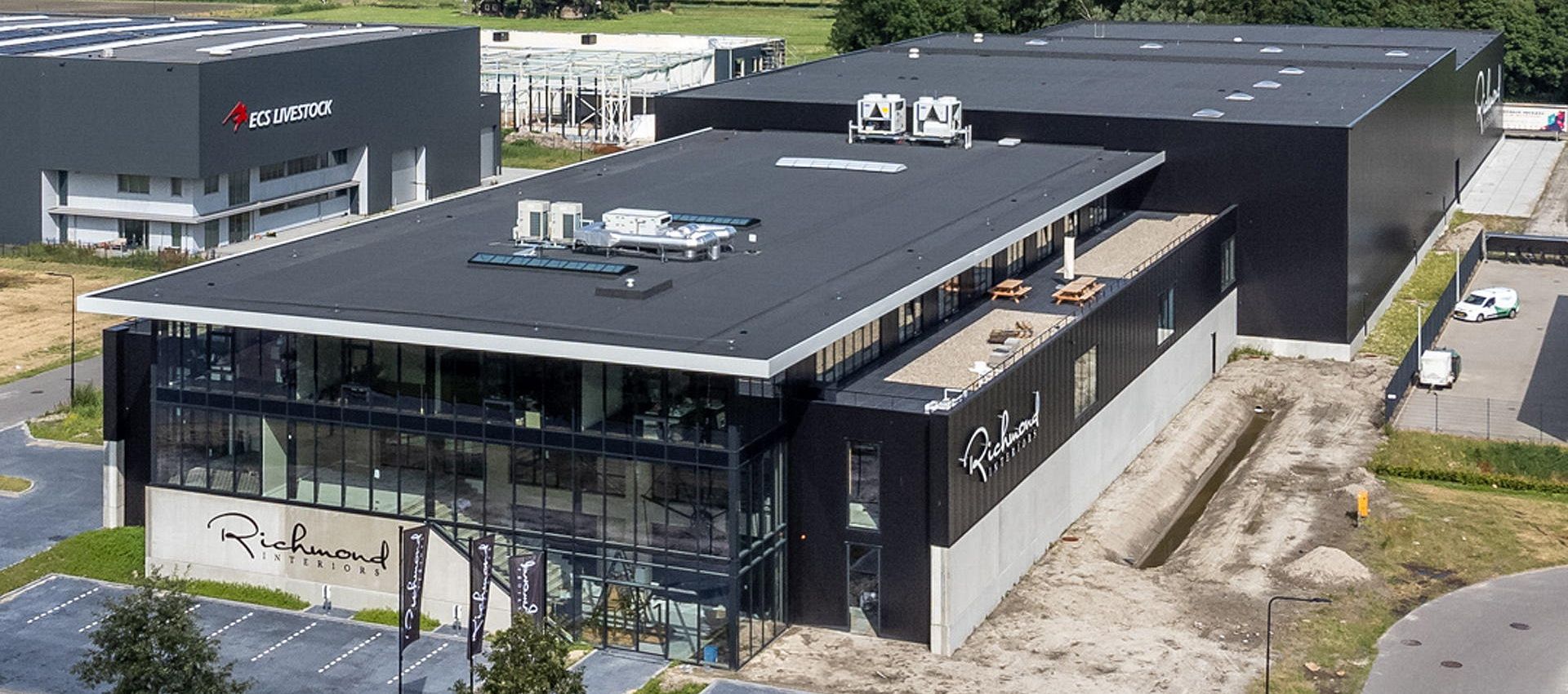 Het pand heeft een duurzame installatie met een lucht-water warmtepomp voor o.a. de verwarming. Daarnaast komen er ook 494 zonnepanelen van 540 Wp op het dak te liggen. Hiermee wordt de fossiele energie behoefte volledig gecompenseerd (BENG 2 = 0). Hiermee is Richmond Interiors volledig voorbereid op een toekomstige duurzame bedrijfsvoering!