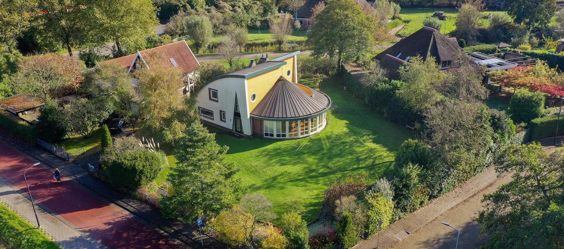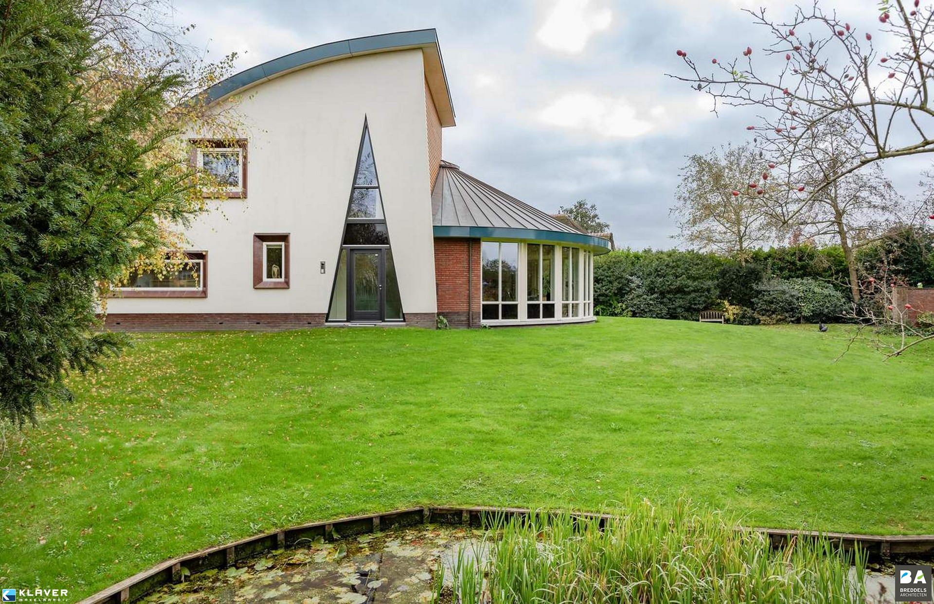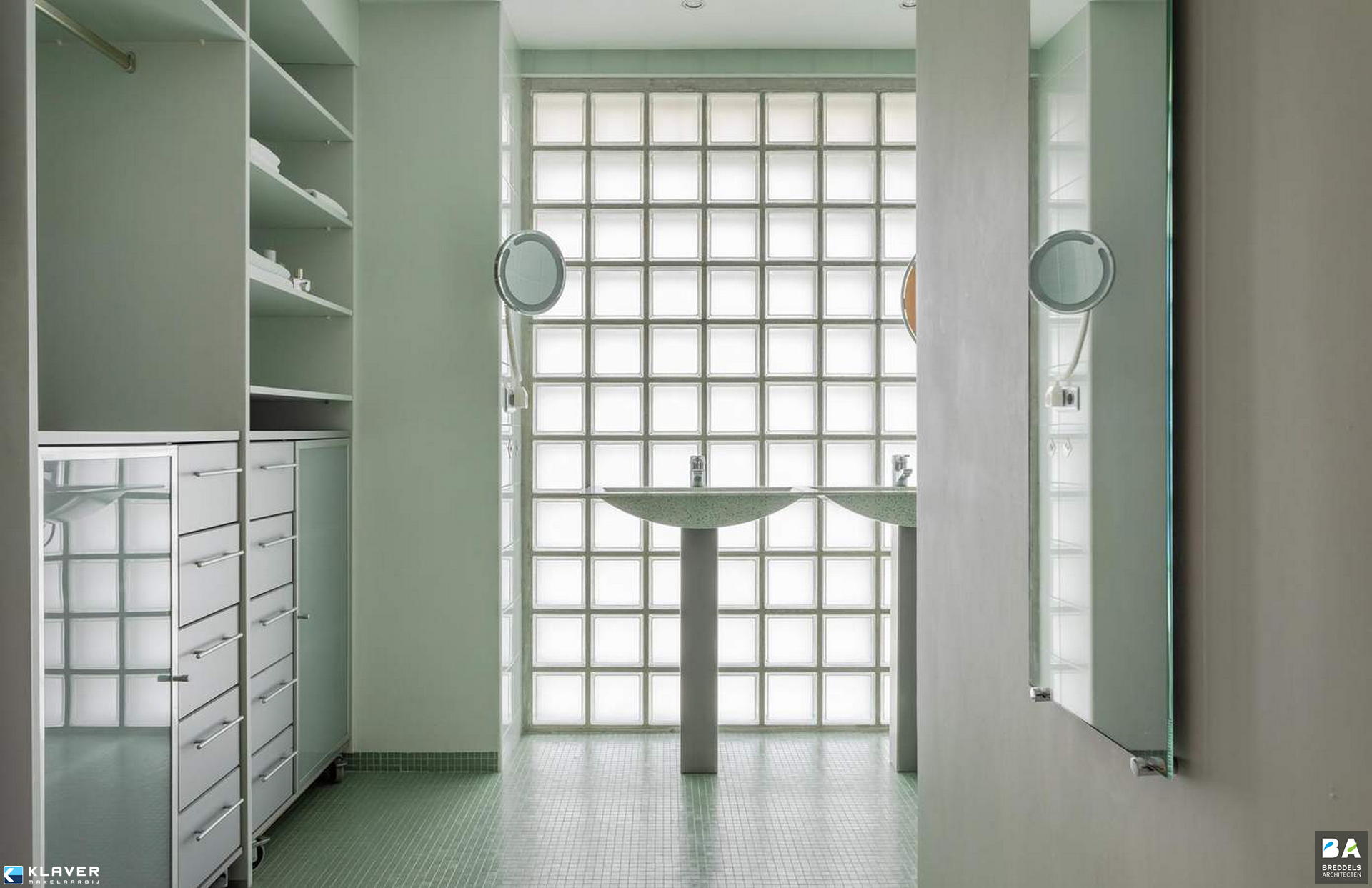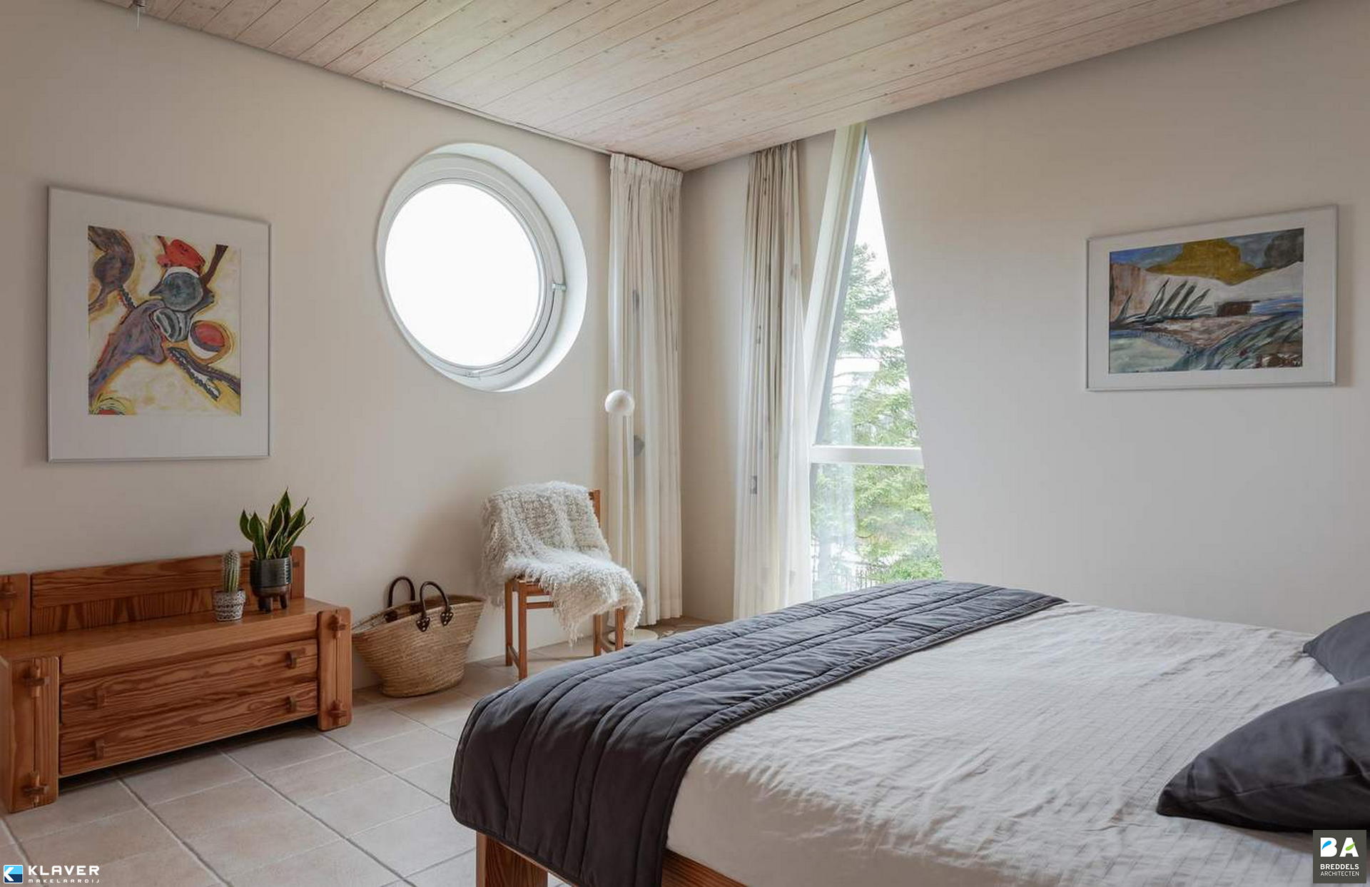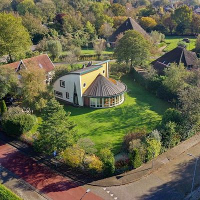 De architectuur komt buiten tot leven in een spel van verticale en horizontale lijnen, afgerond met unieke ronde vormen. De ramen zijn omlijst met bruin marmer, en als eyecatcher springt de royale, half ronde serre met een koper afgewerkt dak direct in het oog. Binnen voelt de woning ruim en comfortabel aan en heeft maar liefst vier slaapkamers. De master bedroom bevindt zich op de begane grond en beschikt over een royale ensuite badkamer, wat de woning niet alleen ruimtelijk maar ook levensloopbestendig maakt. De zorgvuldige eenheid in stijl en materiaalgebruik loopt door tot in de nok van het huis, wat de woning een rustgevende uitstraling geeft.