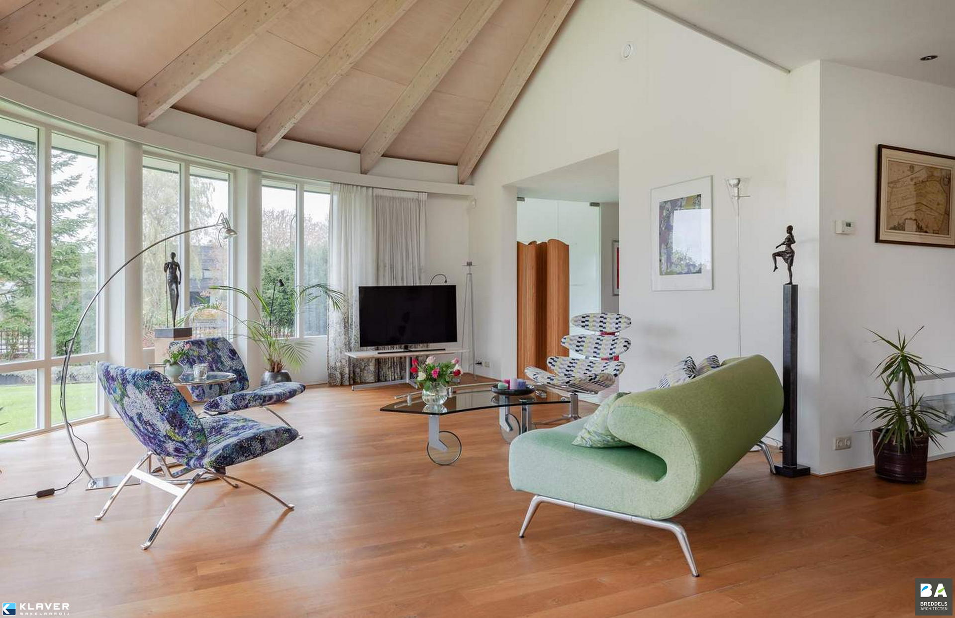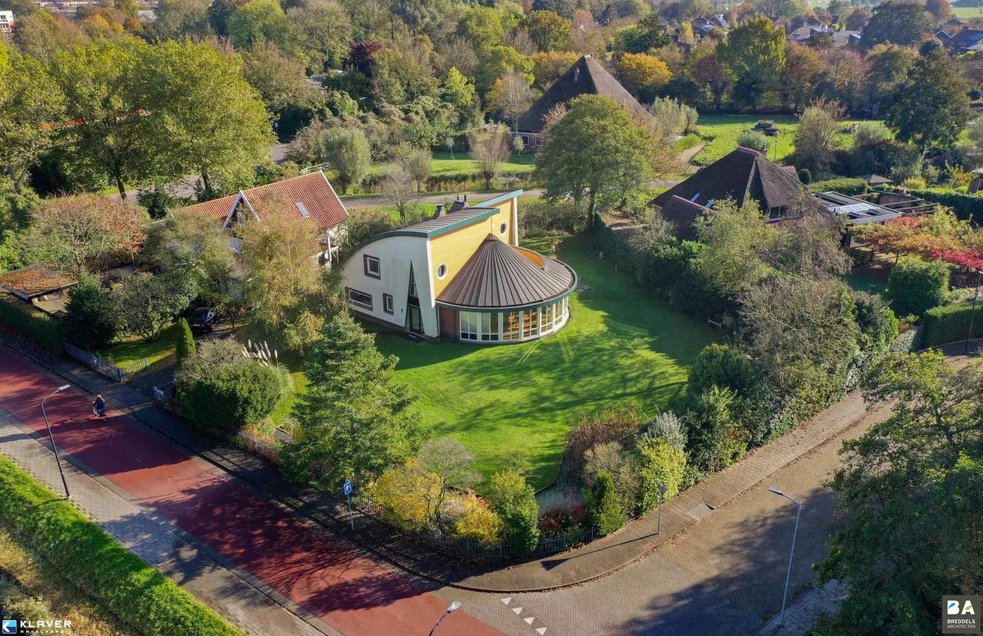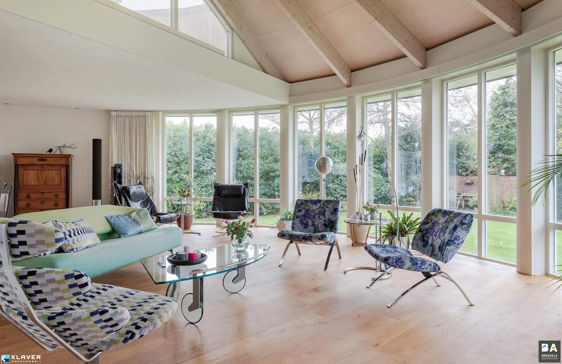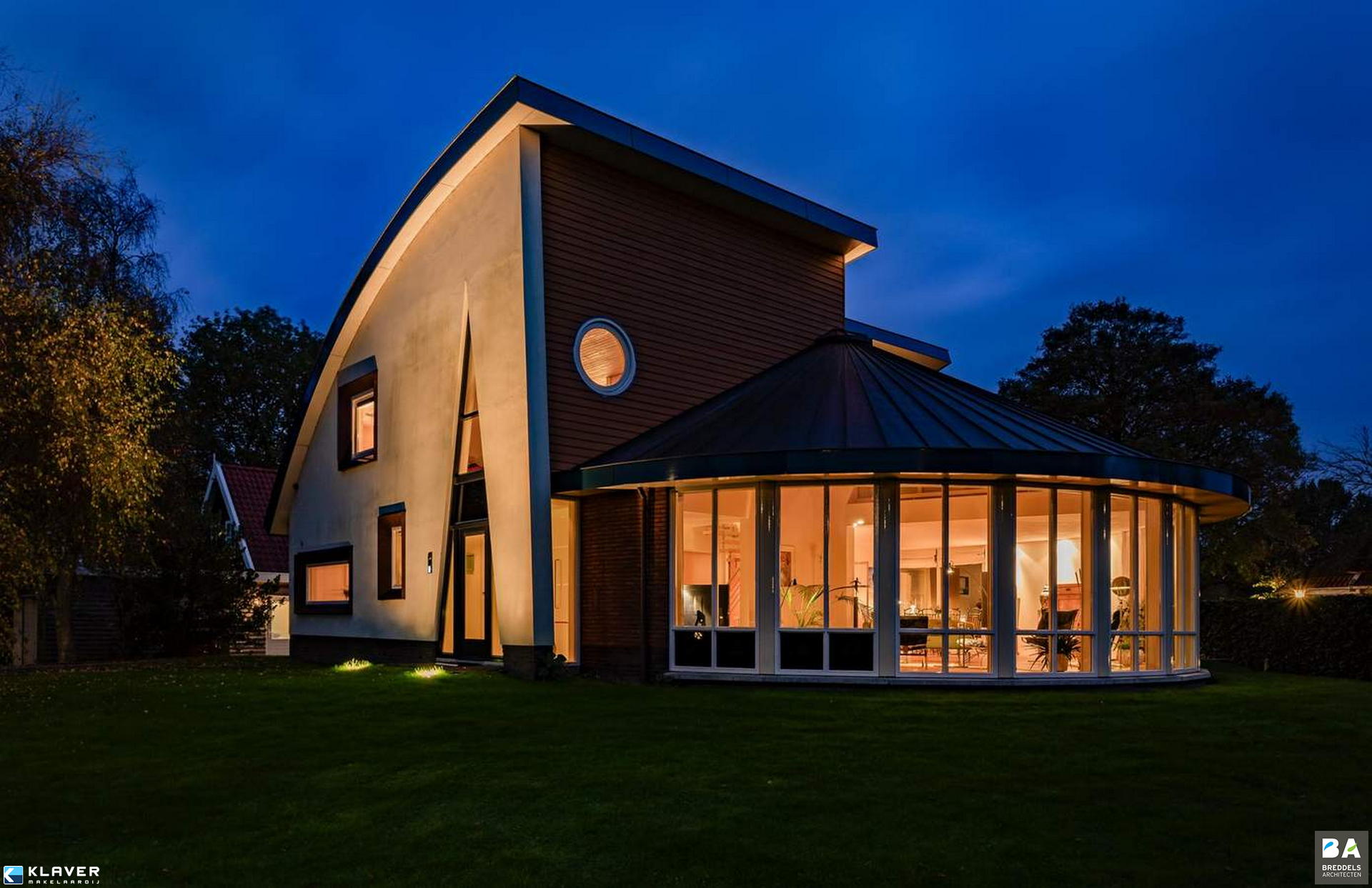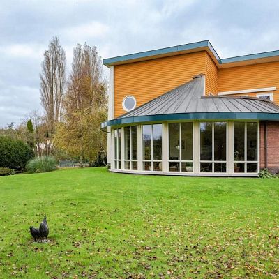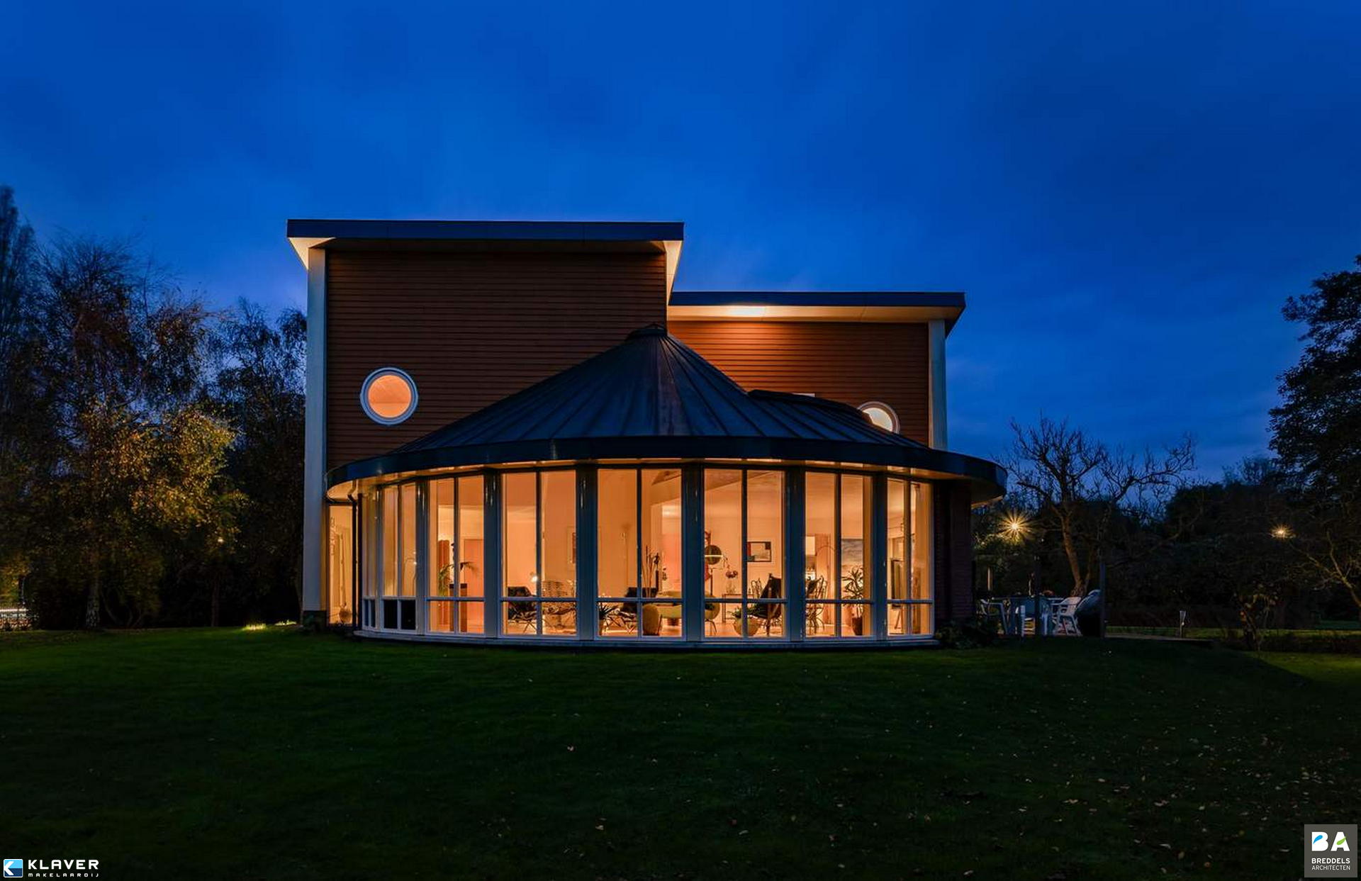 De architectuur komt buiten tot leven in een spel van verticale en horizontale lijnen, afgerond met unieke ronde vormen. De ramen zijn omlijst met bruin marmer, en als eyecatcher springt de royale, half ronde serre met een koper afgewerkt dak direct in het oog. Binnen voelt de woning ruim en comfortabel aan en heeft maar liefst vier slaapkamers. De master bedroom bevindt zich op de begane grond en beschikt over een royale ensuite badkamer, wat de woning niet alleen ruimtelijk maar ook levensloopbestendig maakt. De zorgvuldige eenheid in stijl en materiaalgebruik loopt door tot in de nok van het huis, wat de woning een rustgevende uitstraling geeft.